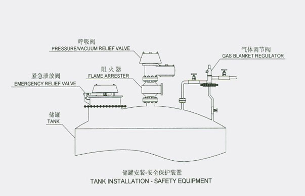 上图是典型的储罐安全保护装置安装图。大多数储罐上均安装有呼吸阀、紧急泄放阀(或紧急泄放人孔)和气体调节阀等装置。